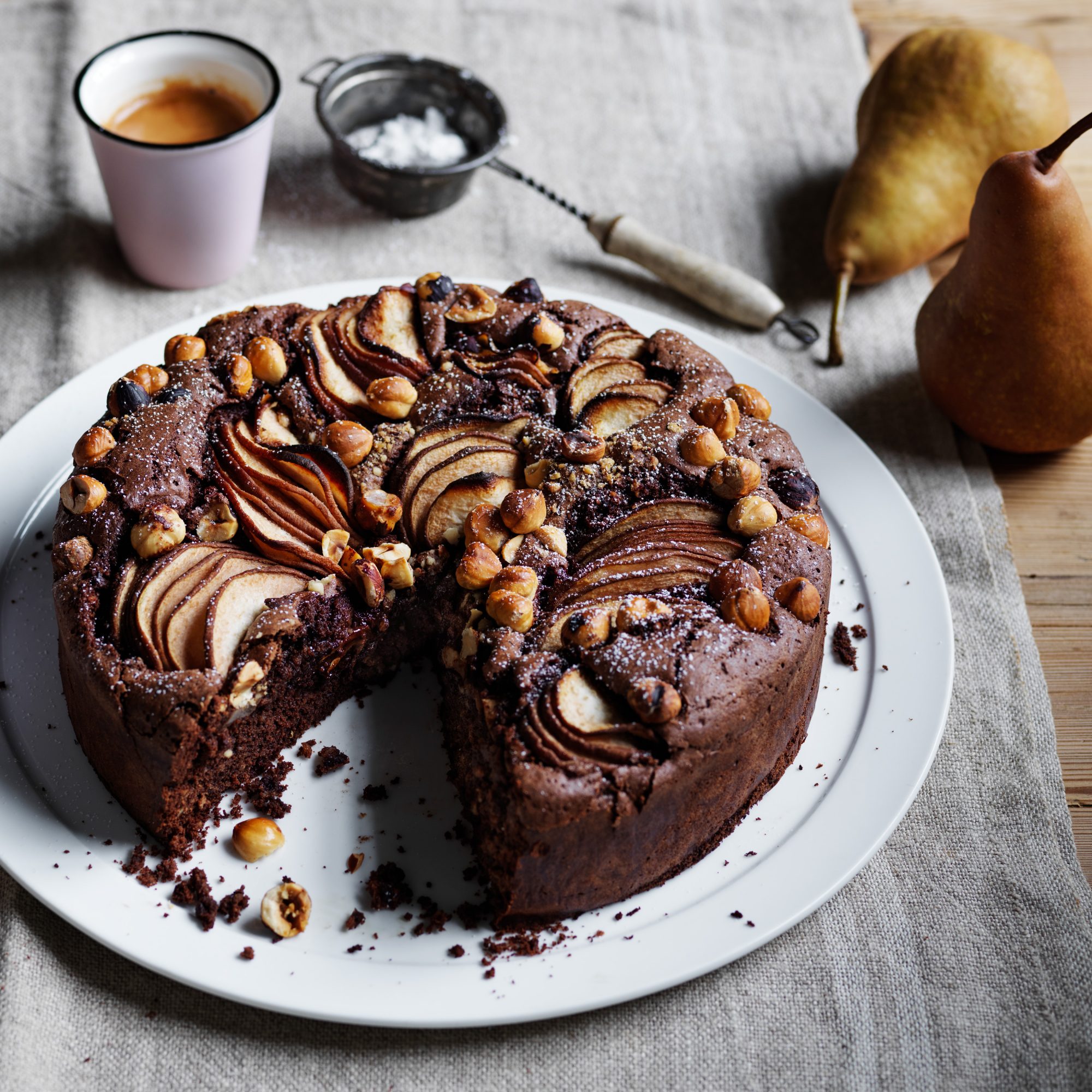 Top with pears then sprinkle over roasted hazelnuts. Bake 1 hour 15 minutes until a skewer inserted into centre comes out clean. Cool in the pan for 1 hour. Transfer to a wire rack to cool. Dust with icing sugar. Serve with cream.