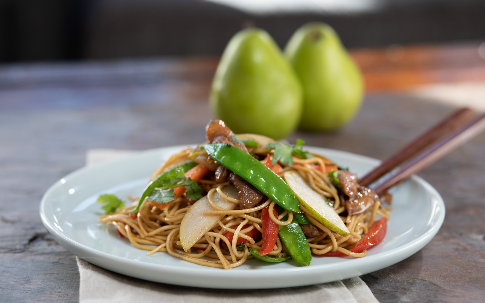 Add noodles, pear and spring onion and give a quick stir